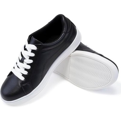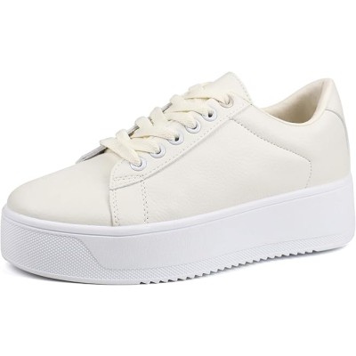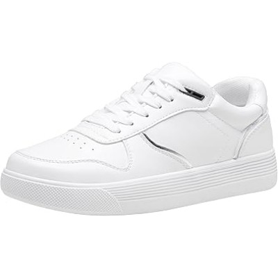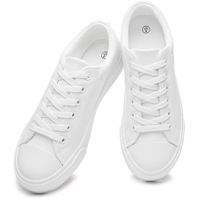 Women's Synthetic Leather White Tennis Shoes,Lace up White Sneakers,Low Top Fashion Sneakers