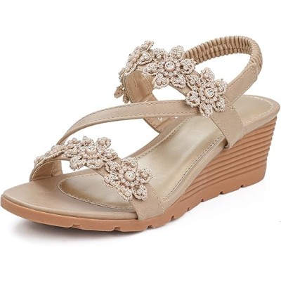 Womens Sandals Wedge Flower: Open Toe Elastic Ankle Strap Wedge Sandal